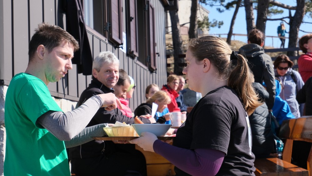 Tako so povedali prostovoljci, ki so dva dni stregli na Tumovi koči. Takšnega dogajanja ni bilo leta 2018 in 2019, saj je bilo takrat slabše vreme. Tokrat je bilo sončno, na vrhu Slavnika je močno pihalo, razgled je segal vse do morja, Dolomitov, zasneženega Snežnika, Hrvaške ... Obiskovalci so zapolnili notranje in zunanje mize, nekateri so počivali na travniku. Prostovoljci so stregli tam, kjer so lahko, in prilagajali ritmu dela, ki jih je zahtevala sama strežba. So bili pa prostovoljci, ki so se javili, da pomagajo ekipi.