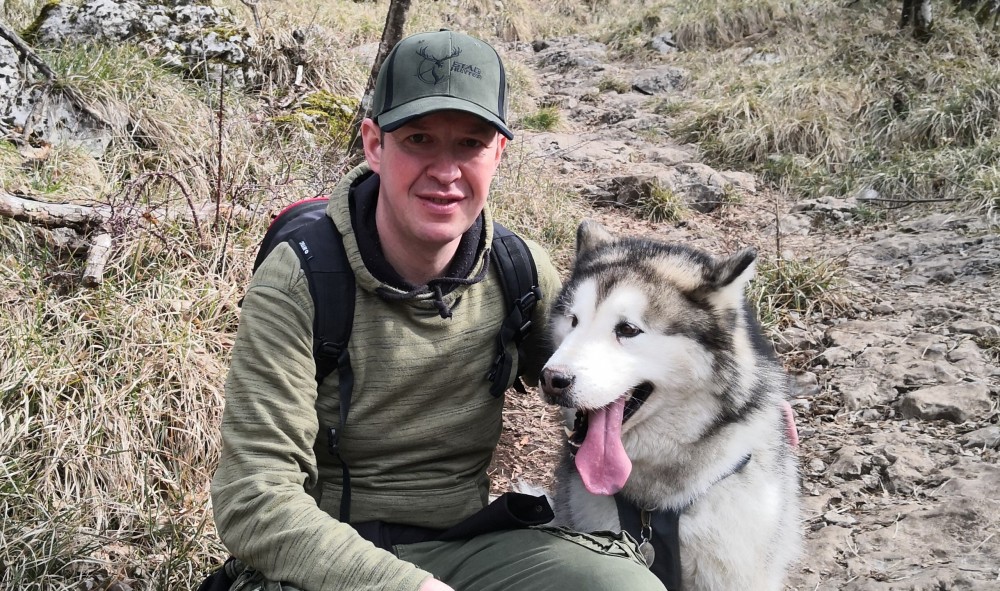 Na sliki Sašo kleči ob psu in ga objema, v ozadju se megličasto vidijo hribi, foto osebni arhiv Sašo Dreven