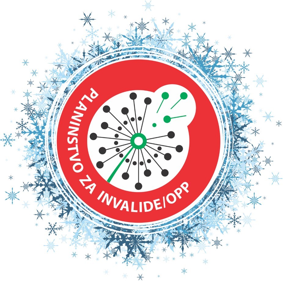 Na sliki voščilnica v levem delu logo planinstvo za invalide/OPP obdan s snežinkami, na dnu je zapis www.pin-opp.pzs.si in logo Planinske zveze Slovenije, odbora Planinstvo za invalide/OPP, delovnih skupin Gluhi strežejov v planinskih kočah, Gibalno ovirani gore osvajajo, Slepi/slabovidni planinci po Slovenski planinski potim, Nevrorazlični na desni strani besedilo