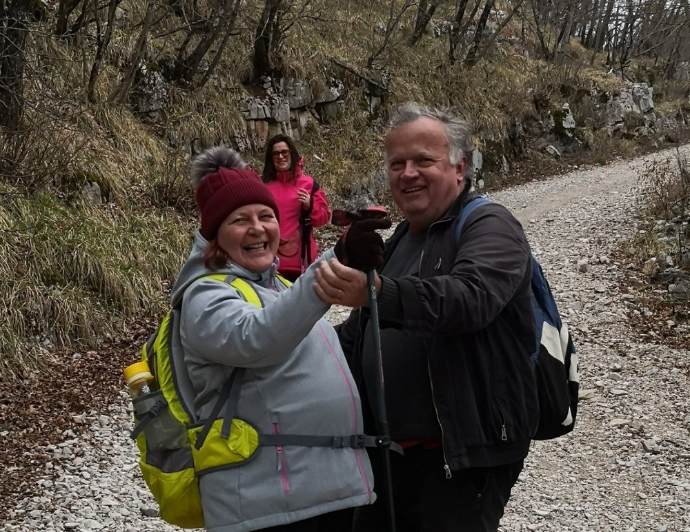 Deloma sem že opisala, na kaj me opozarja. Zelo je odvisno po kakšnem terenu hodiva. V domačem okolju samo dvigne ali pa spusti komolec, pa že vem, če moram stopiti gor ali dol, opozori me na stopnice, posebno pomembno je, da pove, če so navzgor ali navzdol, celo če hodiva brez palice. V hribih mi pove, če je potrebno stopiti posebej visoko ali nizko, če je koreninasti teren, skala ali večji kamen na poti oziroma nepričakovane ovire. Dosti hodiva tudi tako, da drživa vsak en konec palice in glede na to, na katero stran on usmeri palico, tja jaz stopim. Pri tem načinu moram biti zelo pozorna na premike palice, ker se kaj hitro lahko zgodi korak narobe. Ko sva ta način začela osvajati, sem se kar naenkrat znašla v globoki jami, ker mi je za en korak padla pozornost. Če teren ni preveč zahteven, mi sproti pove kaj vidi. Kaj reče, ko je posebno težko, ne boste hoteli zapisati, zato tega ne povem, a takrat vem, da moram biti zelo previdna in da moram dosledno upoštevati njegova navodila. Opogumi me že s tem, da se ne obotavlja, ko si zelo kam želim iti in da me vedno pohvali, celo če so moji dosežki težavno dostopni. Ni mu vedno enostavno, a skupaj zmoreva. Res se včasih drži za glavo, ko jaz rečem, da imam idejo, ker po tem stavku vedno pride izziv.