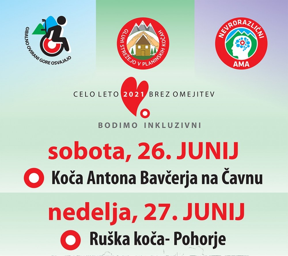 četrtek, 17. junij 2021 ob 00:00,  ogledov: 2311 Skupaj v hribe 26. junija na Čaven in 27. junija na Pohorje| Objavil(a): Marjeta Čič |   | Vabljeni na inkluzijski pohod 26. junija na Čaven in 27. junija na Ruško kočo in Cojzarico. Gibalno ovirani gore osvajajo (GOGO) , Skupaj v hribe Nevrorazličini AMA (avtizem, motnja v duševnem razvoju, ADHD) in Gluhi strežejo v planinskih kočah so akcije, ki se med seboj povezujejo. Na poti do koče bodo tudi prostovoljci.