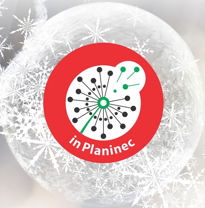 Na sliki logo inPlaninec na leddeni krogli na katero sneži, spodaj levo se vrstijo logo PZS, spletna aplikacija inPlaninec, gluhi stežejo v planinskih kočah, gibalno ovirani gore osvajajo, nevrorazlični AMA, odločen korak (slepi in slabovidni), paraplezanje, v denem delu je besedilo voščilnice in logo odbora inPlaninec