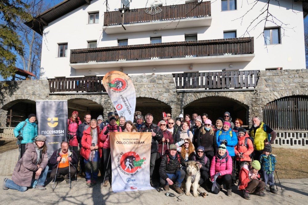 Na sliki skupina pohodnikov z zastvao Odločen korak, v ozadju so otroška igrala, drevesa brez listja, rjava trava, vrh Mrzlice z oddajnikom, arhiv inPlaninec Pri domu na Mrzlici smo se nekateri še odpravili prav do vrha, kjer stoji oddajnik (1122 m), nato pa smo se po dokaj strmem travnatem pobočju spustili do Kala, ki je malo nižji od Mrzlice (946 m). Ustavili smo se na delu, kjer je z večjo skalo in tablo označen najvišji del Kala, nato pa smo se spustili na rob gozda, kjer stoji prijeten dom na Kalu. V domu na Kalu smo se na kratko ustavili, potem pa se odpravili spet navzgor proti Mrzlici, kjer nam je teknilo »prihojeno« kosilo, ki so ga nam postregli gluhi. Nekateri smo že navezali stik z gluhimi pri naročanju hrane in pijače, saj nam je iz obiskovanja tečaja znakovnega jezika, s katerim gradimo most med svetlobo in zvokom, že nekaj ostalo v spominu. Tudi na tem inkluzijskem pohodu smo se srečale akcije Gluhi strežejo v planinskih kočah, Nevrorazlični avtizem, motnja v duševnem razvoju, ADHD (AMA) in Slepi in slabovidni planinci po Slovenski planinski poti.