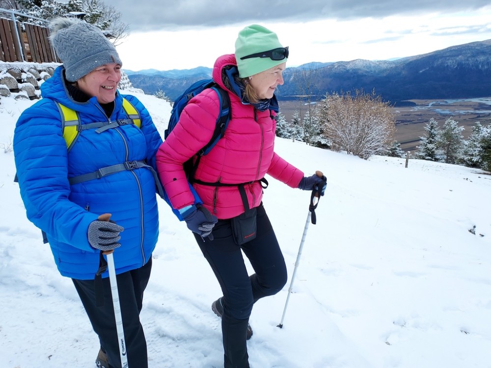 Pričakalo nas je toplo zavetje koče. Postregli so nas z odlično pripravljeno hrano. Po okrepčilu in počitku smo dekleta preizkusila hitrost in učinkovitost čarovniške metle. Smeh je pol zdravja, zato smo si ga privoščile z veliko žlico. Po norčijah smo se podali nazaj v dolino. Nekaj časa smo hodili, vmes se drsali po ledu navzdol in vsi na koncu srečni in zadovoljni prispeli v dolino. Med čakanjem avtobusa in tega, da se vsi zberemo, je med nami zadonela še naša planinska himna Odločen korak, ki sta jo ustvarila za nas Miha in Simona. Prijetno utrujeni a zadovoljni, smo se vrnili domov k počitku, saj sta nas že naslednji dan pričakovala Mrzlica in Kal. V imenu vseh pohodnikov se zahvaljujem vsem skupaj organizatorjem, pohodnikom, spremljevalcem, prostovoljcem zato, da so nam omogočili prijetno dožiivetje zimske neokrnjene narave.