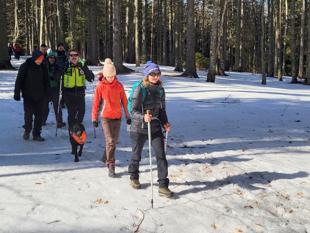 Na sliki skupina planincev hodi po zasneženi gozdni poti, v ospredju je pes vodič, arhiv inPlaninec