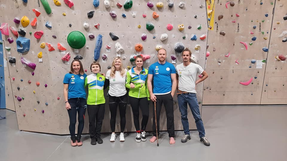 Na sliki pred plezalno steno stojijo štiri ženske in dva moška - Slovenska paraplezalna reprezentanca (foto arhiv reprezentance)
