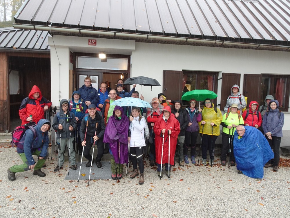 Slepi in slabovidni planinci po Slovenski planinski poti (SPP) z odločnim korakom v kočo na Hleviški planini in Sivko. Dež ni bil prepreka za dva žiga bližje k polnemu Dnevniku Slovenske planinske poti. Vsak se je na svoj način zaščitil pred dežjem. V zrak so držali dežnike, odete so imeli pelerine in tudi kapuce in kape so jih branili pred dežjem.