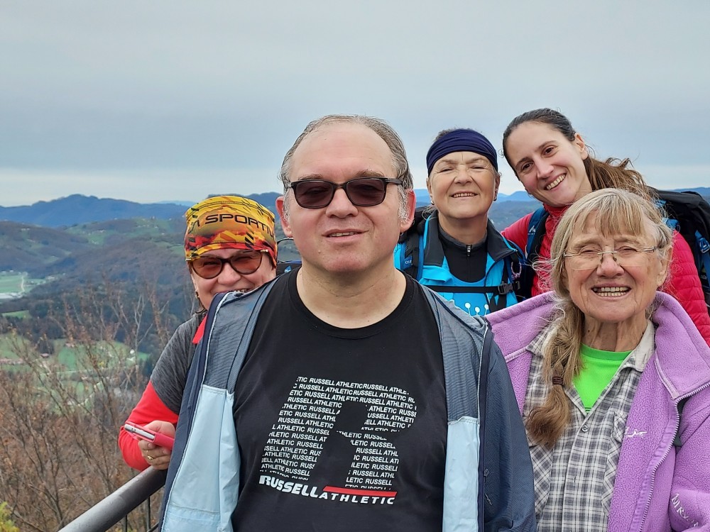 bo skrival v meglenem oblaku. Današnji pohod ni bil naporen. Vreme nam je zelo dobro služilo. Na razglednem stolpu je bilo mrzlo, nekateri smo si že nadeli rokavice.   Na sliki skupina inPlanincev z zastavo stoji pod stolpom na Resevni, arhiv inPlaninec