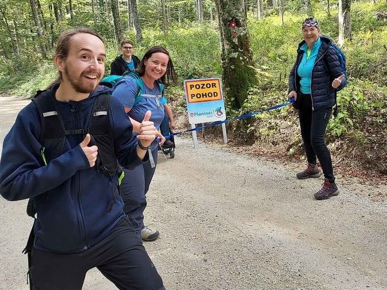 Na sliki po makadamski cesti hodijo trije prostovoljci z osebo na invalidskem vozičku, v ozadju se dviguje zasneženo pobočje na vrhu katerega je oddajnik, arhiv inPlaninec Ko sem prišel do travnika velikonočnic (tik pred domom na Boču, kjer je bil štart pohoda, tisti vikend pa tudi inPlaninec izobraževanje strokovnega kadra za delo z invalidi/OPP v planinstvu. Naletel sem na led, kar je privedlo v odločitev, da grem v Dom na čaj, da si malo oddahnem. Tam pa sem spoznal prostovoljce inPlaninca. Najbolj so mi takrat padli v oči Marjeta Čič, Jurček Novak in Martin Močnik. Ko sem jim na zajtrku predstavil svoj plan trase, sem se po tehtnem razmisleku odločil, da bo stolp na Boču počakal in da je bolje, da grem na tisti lažji del: do koče Velikonočnice. Tam pa sem prvič imel priložnost pomagati pri vleki vozičkov. Čeprav nisem naredil željenega (šel na stolp na Boču), sem pa dopoldne preživel v dobri družbi, doživel nekaj novega (vleka vozičkov), odpel nekaj pesmi, ter se nato iz koče Velikonočnica poslovil in se odpravil v dolino, od koder sem šel nato še v Zibiko pozdravit sorodnike. Sledila je Gora Oljka, 14. maj 2022. Eden izmed najbolj drznih pohodov. Na tem pohodu sem srečal tudi skupino ESC, mednarodne mladinske prostovoljce, in njihovo mentorico Barbaro. Ker sem takrat bil še »zelenec« glede pomoči pri vleki vozičkov (eni so imeli vrvi, drugi ne) nisem vedel, da bi jo tisti, za katerega sem poprijel moral imeti. Vodja je naznanil odhod in tako sva s Harisom imela »solo vzpon« do gostilne Jug, kjer sva na mojo željo in tudi na željo mimoidočih, ki so videli napore, počakala na »okrepitve« in vrvi, da smo varno prišli do vrha, kjer smo imeli zasluženo kosilo. Takoj po kosilu pa sem moral oditi nazaj v dolino, saj smo imeli z MoPZ Savinjski zvon revijo pevskih zborov še isti dan. 9. Julija je bila nato izvedena tudi tekma (tek na Goro Oljko), ki je sicer potekala iz Andražke smeri, a zadnja strmina je bila enaka kot na inkluzivni pohod na Goro Oljko. Tisto sem odtekel z nasmeškom na obrazu. Takrat sem bil 2. v svoji kategoriji.