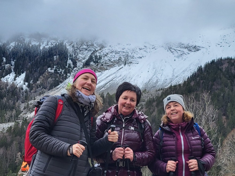 Na sliki stojijo pred zasneženo planinsko kočo tri ženske s pohodnimi palicami gledajo v objektiv, na desni stoji moški z nahrbtnikom in pohodnimi palicami inje obrnjen bočno in gleda predse, v ozadju so tri osebe, arhiv inPlaninec Polna pozitivne energije se vračam nazaj v dolino. Stkale so se nove prijateljske vezi, nova poznanstva. Zapisale nove življenjske zgodbe. Nekatere lepe, druge žalostne. Vračamo se nazaj proti prestolnici. Dežuje. A komu mar. Zame danes sije sonce, Sonce, ki ga spremlja barvita mavrica. Resnična. Vse do Ljubljane na nedeljo, 25. februarja 2024. Hvala moji prijatelji. Hvala ker ste in boste v prihodnje.